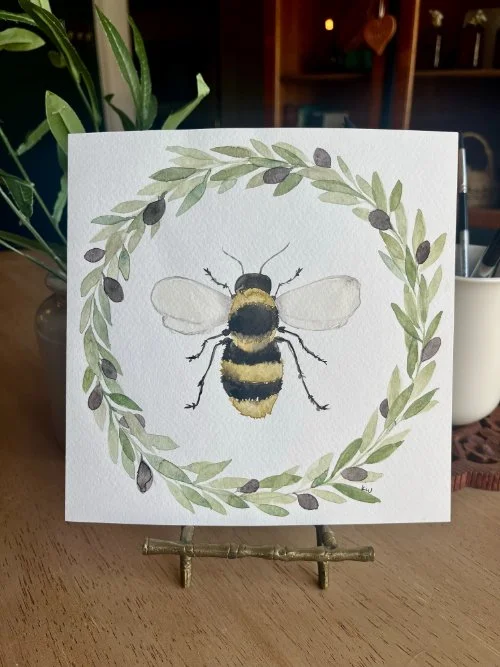 Watercolor insects on paper. Some displayed in vintage frames or with pressed botanicals.